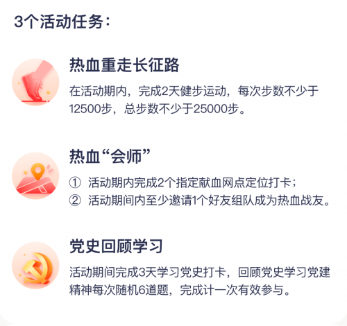 關注無償獻血的愛心人士,通過微信關注 “熱血跑”、“血之緣”官方公眾號以及聯合發起采供血機構的官方公眾號,提交相關信息資料即可報名參與。在活動期間內,完成3項任務“熱血重走長征路”,“熱血‘會師’”,“黨史學習”內容如下: