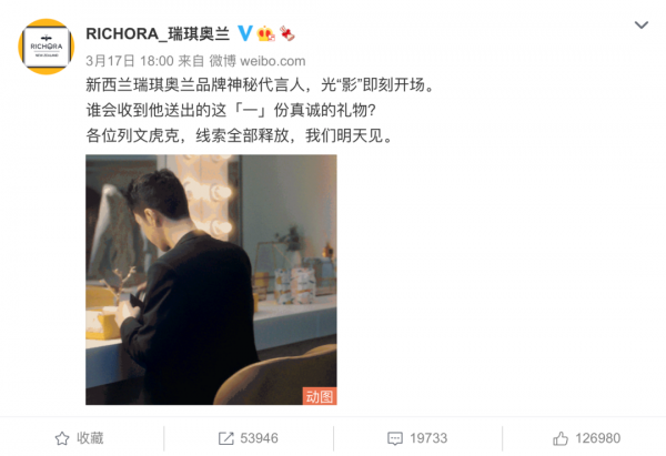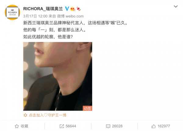 為逆轉過往品牌官宣前粉絲熱情低、互動少的狀態,瑞琪奧蘭創意顛覆以往簡單的圖文官宣預熱,透過飯愛豆對王一博粉絲喜好的了解,借力代言人顏值直擊粉絲心臟,精準抓住手、喉、眼、背影四大蘇點,打造【攜手篇】、【等“喉”篇】、【耀眼篇】、【光影篇】四個特寫動圖造成直觀視覺沖擊,使得代言人未正式官宣即吸引到大量粉絲關注,4條預熱微博轉評贊收獲近100萬互動量。
