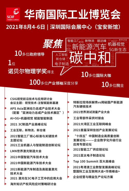 展會同期,華南工博會還將為參會觀眾提供應用行業細分市場的專屬配套活動,包括:APS Asia亞洲動力總成產業技術大會、2021 3C制造產業高峰論壇、2021智能工廠核心標準與關鍵技術主題論壇、2021工業機器人與智能制造創新論壇、工業零部件采供對接會、“十四五”中國制造業高質量創新發展論壇——企業數字化升級行業應用專題論壇、IMCA 2021世界測試測量產業大會暨博覽會、2021中國智能汽車技術大會、2021中國新能源汽車技術大會、2021粵港澳工業數智發展高峰論壇暨國際工業互聯網大會<華南峰會>等近30場高端峰會、產業論壇和供需采配會。