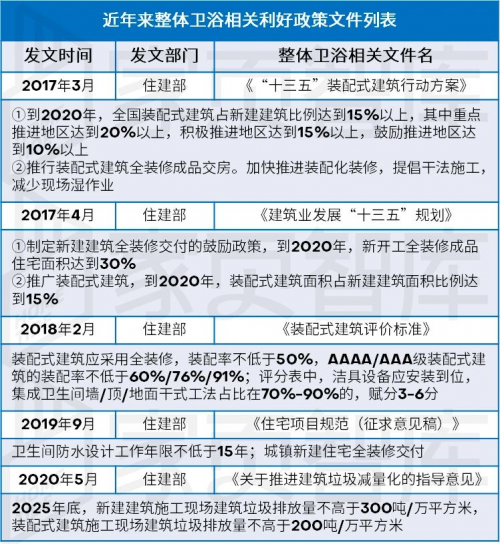 ◎裝配式建筑相關政策助力,整體衛浴行業滲透率低位提升