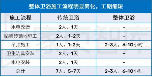 當前整體衛浴施工最快僅需2人4小時即可完成,而傳統衛浴所需十余個工種,裝修工期至少十六天,時間成本優勢明顯。
