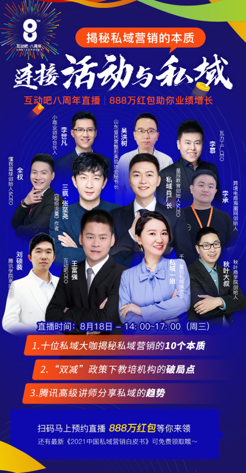 國(guó)內(nèi)最大的活動(dòng)發(fā)布平臺(tái)之一“互動(dòng)吧”,將于2021年8月18日迎來成立8周年紀(jì)念日,屆時(shí)互動(dòng)吧CEO王富強(qiáng)先生,將直播連線私域一姐、秋葉大叔、騰訊學(xué)院高級(jí)講師、私域肖廠長(zhǎng)、《超級(jí)流量》作者三瘋等眾多大咖,共同帶來私域營(yíng)銷本質(zhì)、如何抓住私域流量紅利、探討“雙減”政策下教培機(jī)構(gòu)的破局點(diǎn)等精彩內(nèi)容。據(jù)悉,本次互動(dòng)吧8周年直播峰會(huì)將于8月18日14:00在視頻號(hào)、抖音、快手等同步播出。