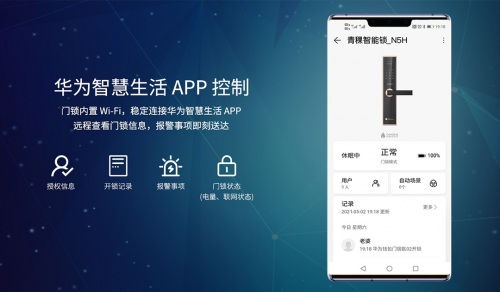 青稞N5H支持HUAWEI HiLink,用戶通過華為智慧生活 APP,可以實時查看門鎖狀態和信息、查詢開鎖記錄;親朋好友突然來訪,可以在智慧生活APP創建臨時密碼;還能與HUAWEI HiLink生態產品聯動,自由定制智慧生活方案。
