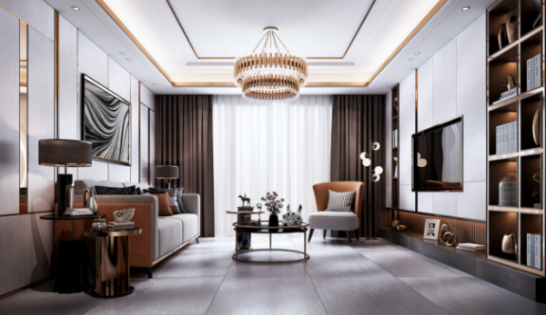 客廳空間以白色為主色調,再用少量的棕色、金色做點綴,層次鮮明,對比強烈,營造出充滿現代優雅的華麗感。