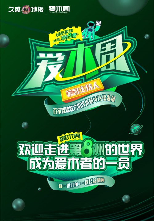 自2014年久盛推出“愛(ài)木周”品牌活動(dòng)以來(lái),每年都以不同的主題和意義呼吁更多的愛(ài)木者與久盛一起宣揚(yáng)愛(ài)木、懂木、治木的理念。今年,久盛提出“綠色星球,共住第8洲”的主題,更將通過(guò)一個(gè)訂單=一份公益,號(hào)召消費(fèi)者們?yōu)榫G色、健康、美好空間提供更多的力量。