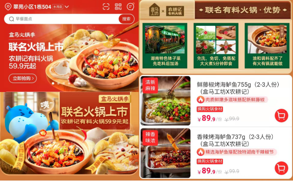 近日,農耕記聯合盒馬鮮生推出新品——“有料火鍋”系列產品。石門肥腸煲、鮮藤椒烤海鱸魚、香辣臭桂魚、豬手煲鳳爪等7款新產品上線了盒馬深圳門店以及盒馬APP,正式開啟快手菜領域的新征程。其中黃燜牛三鮮與石門肥腸煲更是出現了上線當日,便售罄的情形,令人驚喜。