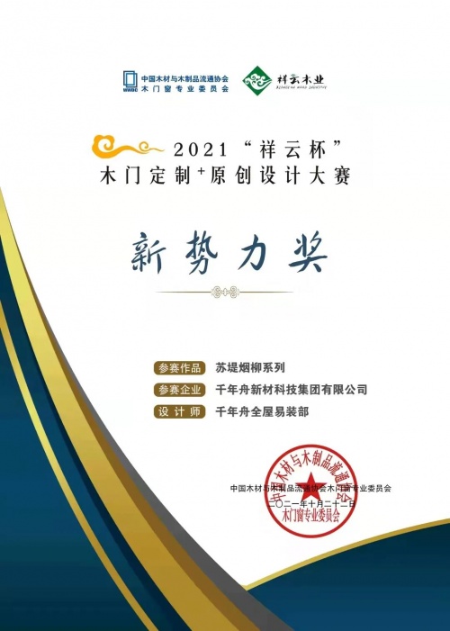 會上,千年舟再次刷新品牌榮譽榜!旗下「木作產品-蘇堤煙柳系列產品」喜獲2021年“祥云杯”木門定制+原創設計大賽新勢力獎!