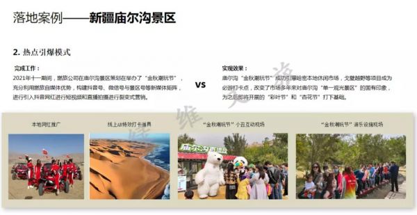 新、奇、特的產品容易成為網紅,但真正成功案例的背后都有歷史文化或創意的支撐,開發團隊需要在精準分析產品特色、目標市場與旅游休閑時尚元素的基礎上,著重挖掘景區文化,為網紅產品的“新奇特”找到落腳點,放大其獨特屬性,融入到品牌定位與產品主題之中。新的網紅品牌形象體系進行優化設計,針對不同客群制定針對性的策劃宣傳口號、網紅活動策劃、網紅商品策劃、網紅景觀場景等。制定切實可行的落地營銷方案,包括營銷策略、營銷媒體、網紅達人、營銷方式、營銷周期、執行策略等內容,為后續營銷推廣執行奠定基礎。
