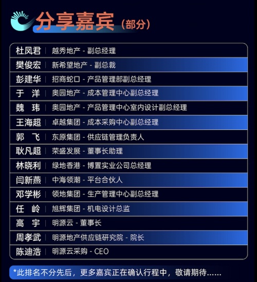 今年,將有1500位“行業最強大腦”,一同問道地產供應鏈未來,包括標桿房企總裁、采購總/成本總,品牌供應商領軍人,地產行業聯盟高層,供應鏈資深專家等。