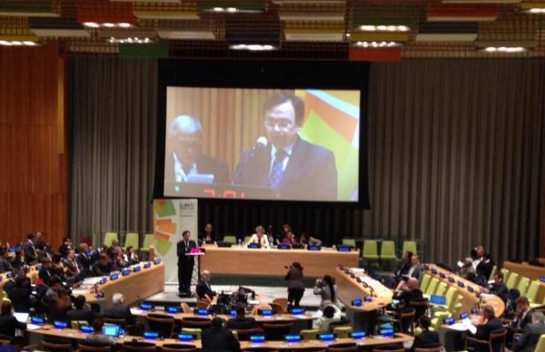 當地時間2014年9月23日,巴黎氣候變化大會前最為重要的大會——2014年聯合國氣候峰會在紐約聯合國總部隆重舉行,來自全球120多個國家的元首和政府首腦齊聚一堂,共同商討全球氣候變化問題。應時任聯合國秘書長潘基文邀請,比亞迪股份有限公司董事長兼總裁王傳福作為全球唯一被邀請的汽車企業代表,出席峰會并發表演講。王傳福指出,城市公交電動化是快速提升城市空氣質量的最佳途徑,全球將迎來城市公交電動化的交通革命。會上,王傳福呼吁各國將電動汽車引入到更廣泛的城市交通領域,并預測:不久的將來,光伏發電及新能源汽車將會成為世界各國的重中之重。