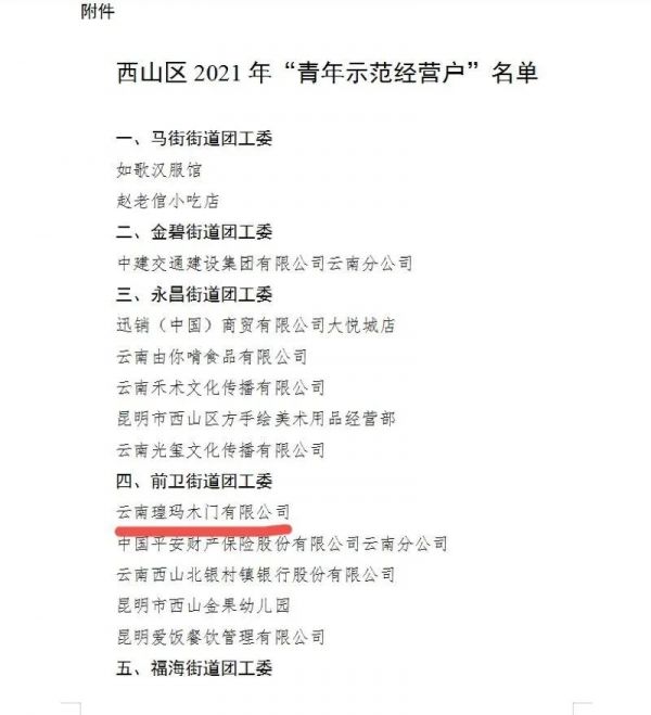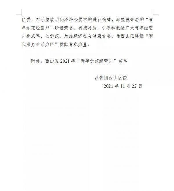 獲評(píng)2021年昆明市西山區(qū)“青年示范經(jīng)營(yíng)戶”,為西山區(qū)建設(shè)“現(xiàn)代服務(wù)業(yè)活力區(qū)”貢獻(xiàn)青春力量,助推經(jīng)濟(jì)社會(huì)健康發(fā)展。