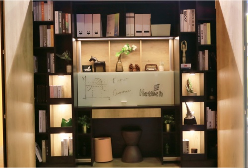 后疫情時代,工作方式的變革對新型家居提出了新需求。越來越多的人選擇長期在家辦公,這便需要極具性價比的解決方案,既能與家居空間設計融為一體又能帶來靈活的工作環境。在本次展會上,德國海蒂詩Hettich針對性推出WingLine230居家辦公柜。多功能居家辦公柜在門關閉時只是一個衣柜,通過WingLine 230的無下軌折疊門設計,全景式開啟柜內空間,中間的置物架單元可放置書籍或裝飾品,兩側空間存放衣物。門內的置物架通過 TopLine XL 頂部滑動移門系統的運行滑動,隨心任意開啟創意辦公空間。因此,在門板關閉時,只是呈現衣柜的外觀。輕輕一按,全景模式開啟柜內空間,步入式的儲物柜拿取物品非常便捷,當滑動中間的置物架時,原本藏在其中的辦公空間完全露出,從衣柜到儲物柜再到辦公柜,“柜中柜”的設計讓人感嘆創意的精妙。