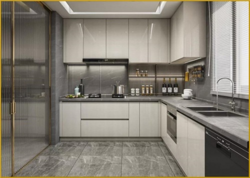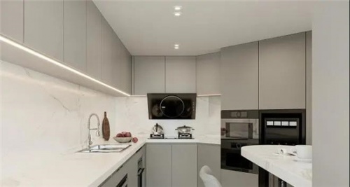 “配套設(shè)施”跟的上,廚房安全有保障。廚房作為家居空間中較為復(fù)雜的家具應(yīng)用環(huán)境,集水、電、氣主要開(kāi)關(guān)和流通 途徑于一處,經(jīng)常會(huì)出現(xiàn)高溫與潮濕的情況,所以廚房的家具用材相對(duì)要求更高。