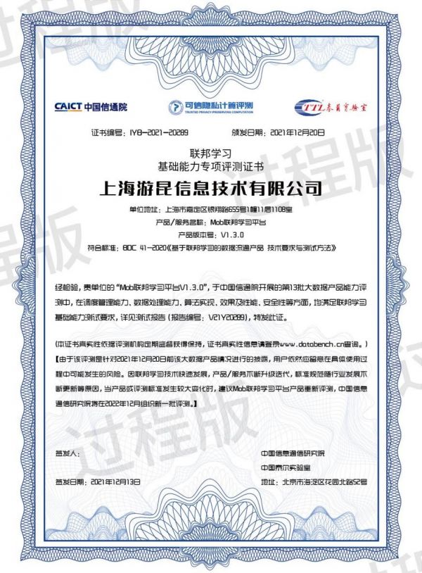 會上重磅公布了第五批【可信隱私計算評測結果】名單,共計46款產品通過評測,此前,MobTech袤博科技積極參與相關評測,經過中國信通院 “大數據產品能力”評審,與華為、科大訊飛、第四范式、百度等22家公司一同取得了《聯邦學習基礎能力專項測評證書》。
