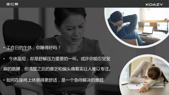 現(xiàn)在年輕人大多過(guò)著兩點(diǎn)一線的生活,家到公司,宿舍到教學(xué)樓。快節(jié)奏的速度和生活學(xué)習(xí)的壓力,讓睡眠、心理健康幾乎必定有或大或小的問(wèn)題。一天除了在寢室或家里,就是在辦公室或圖書(shū)館教學(xué)樓,而考拉累的頭懶枕,就是為了解決坐的舒服和趴著睡的問(wèn)題。