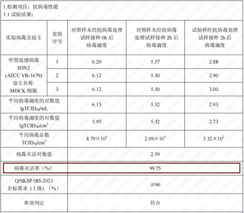 小森科創(chuàng)晶瓷板甲型流感病毒滅活率檢測結果