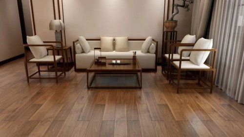 新中式偏愛以原木作為原材料,并注重木材的原生紋理和質感。在地板的選擇上,以傳統的紅黃色、極簡的原木色、和沉穩的胡桃色為主。