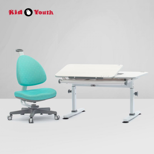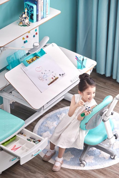 大將作面板可調節角度為0°-45°,共12個檔位,同時滿足孩子在面對讀寫繪畫等不同情況下的使用需求。一體成型收納大抽屜、隱藏式閱讀書檔保證了使用空間足夠大,桌面極簡設計也可以幫助孩子培養專注力。配套的人體工學椅,可支撐人體背部曲線,保護脊椎,舒緩疲勞,釋放腿部壓力,養成正確坐姿好習慣。