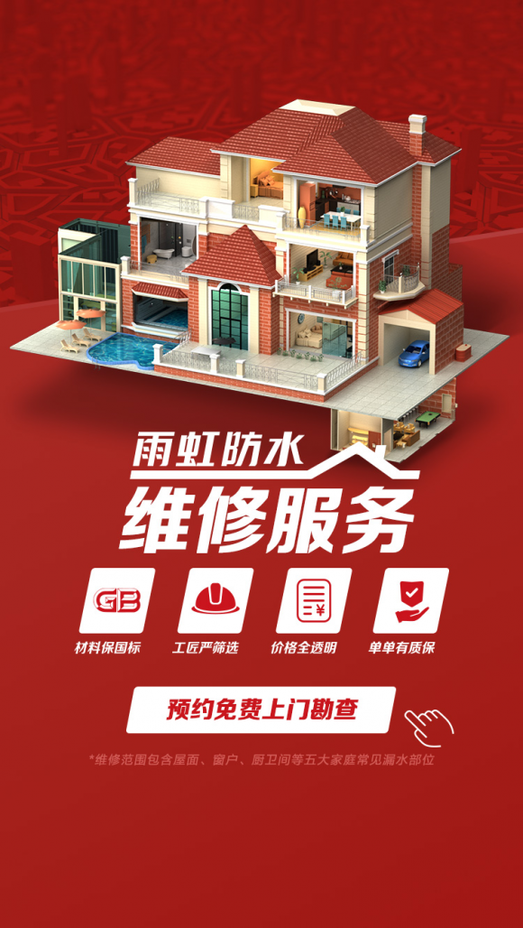 滴水不漏的承諾,萬無一“濕”的保障。雨虹防水維修服務提供專業家庭漏水解決方案,為您徹底解決漏水煩惱。