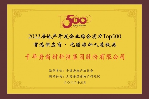 千年舟憑借領先的綜合實力,榮膺「2022年房地產開發企業綜合實力TOP500首選供應商·無醛添加人造板類」代表企業、「2022年房地產開發企業綜合實力TOP500優選健康宅配套家居(板材、地板、木門、衣柜、櫥柜)品牌」兩項榮譽稱號。