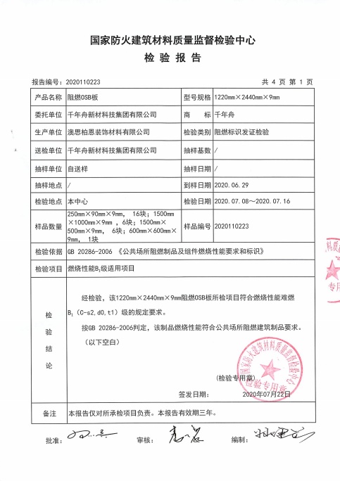 根據國家對難燃板的難燃等級劃分,B級為難燃材料,B1級為B級中的最高標準,千年舟難燃OSB板燃燒性能等級可達B1級,同時產煙特性、燃燒滴落物、煙氣毒性檢測均達到較高要求。